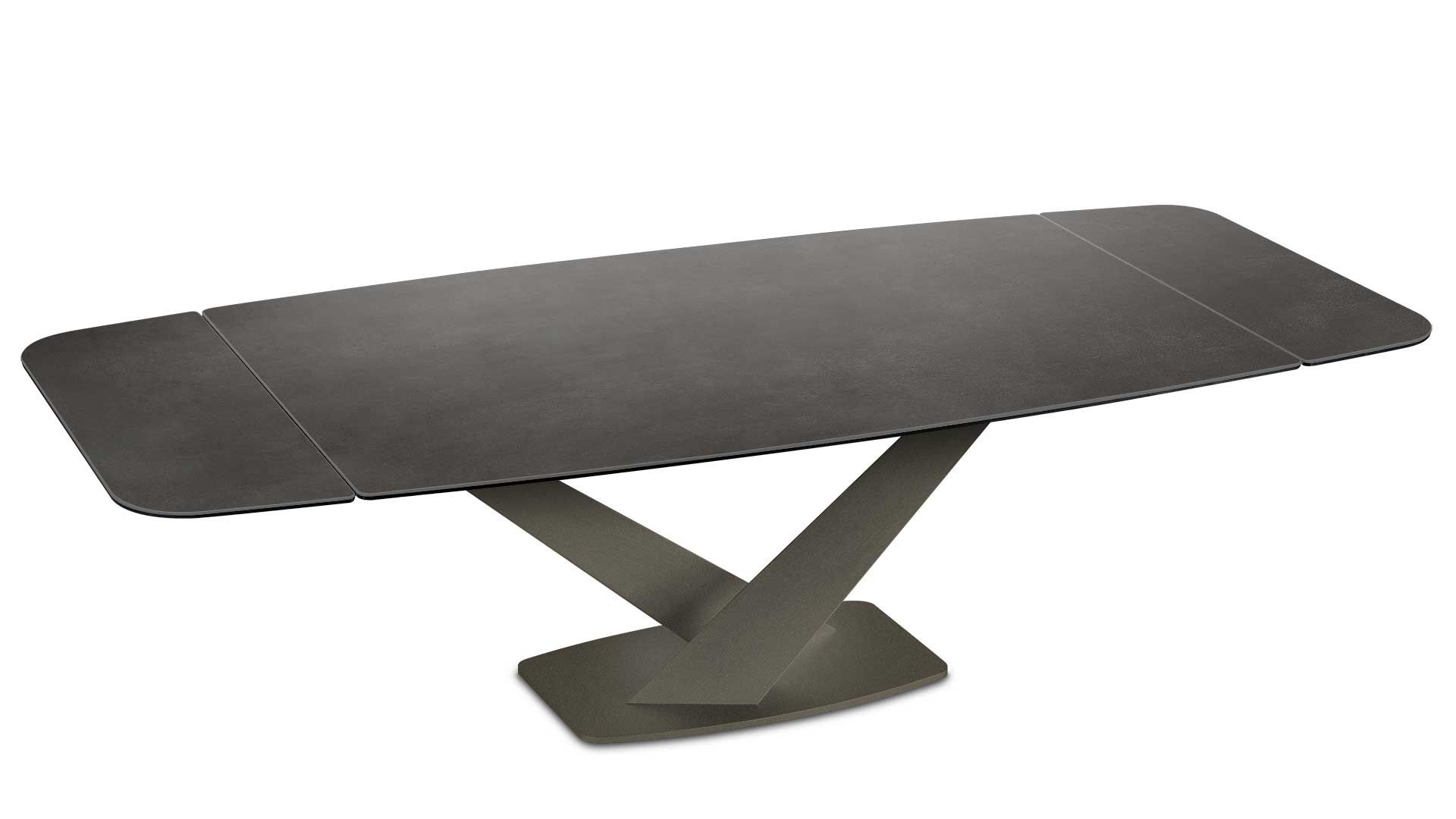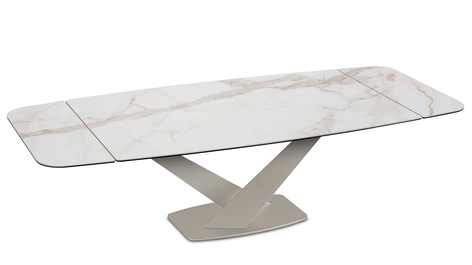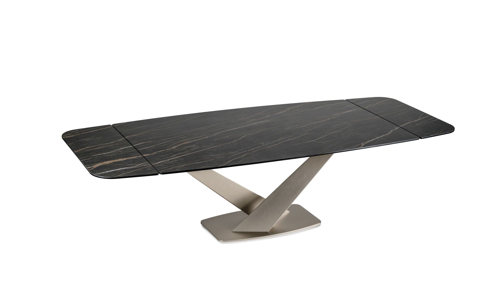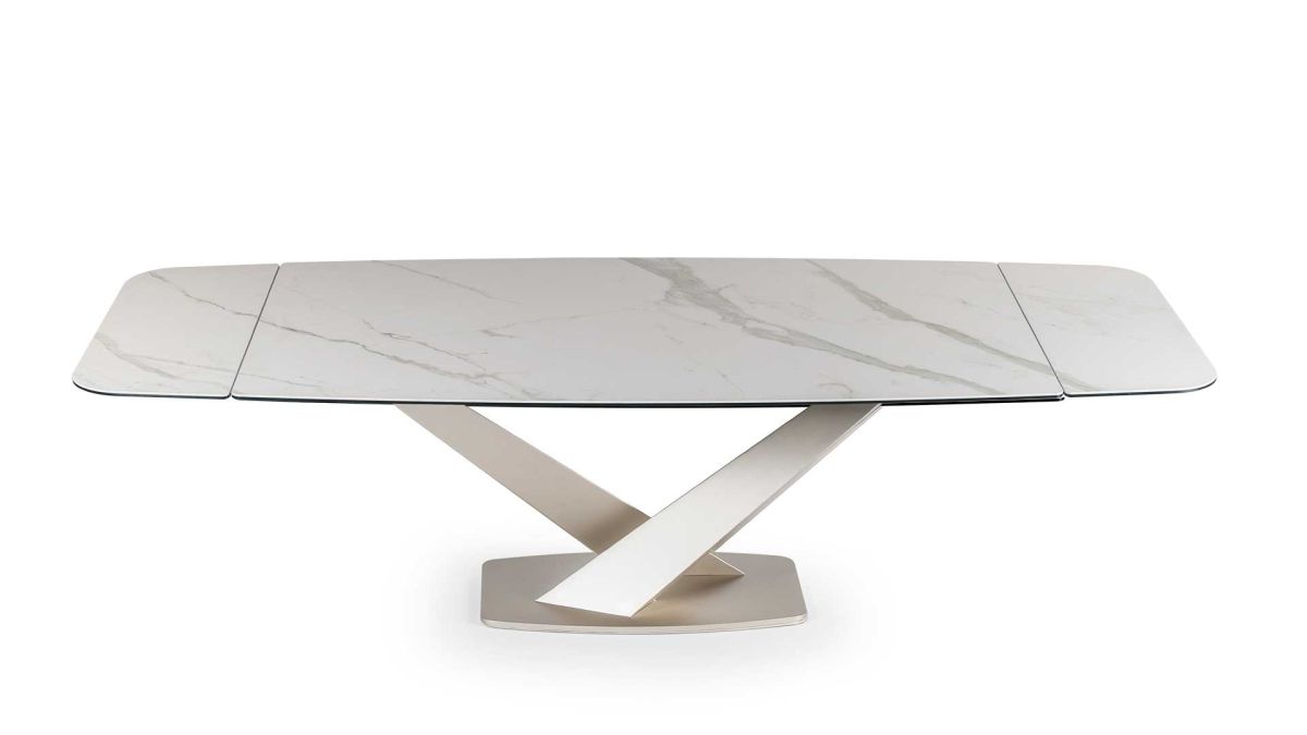 EXTENSIBLE DINING TABLE, WITH TOP AND EXTENSIONS OF GLASS. BASE AND TRACK OF PAINTED METAL. A VERY EASY PATENTED MECHANISM TO PULL OUT THE LATERAL EXTENSIONS ALLOWS THE WIDENING OF THE TOP OF CM 80 (31.5 INCH). AVAILABE ALSO WITH CERAMICS TOPS.