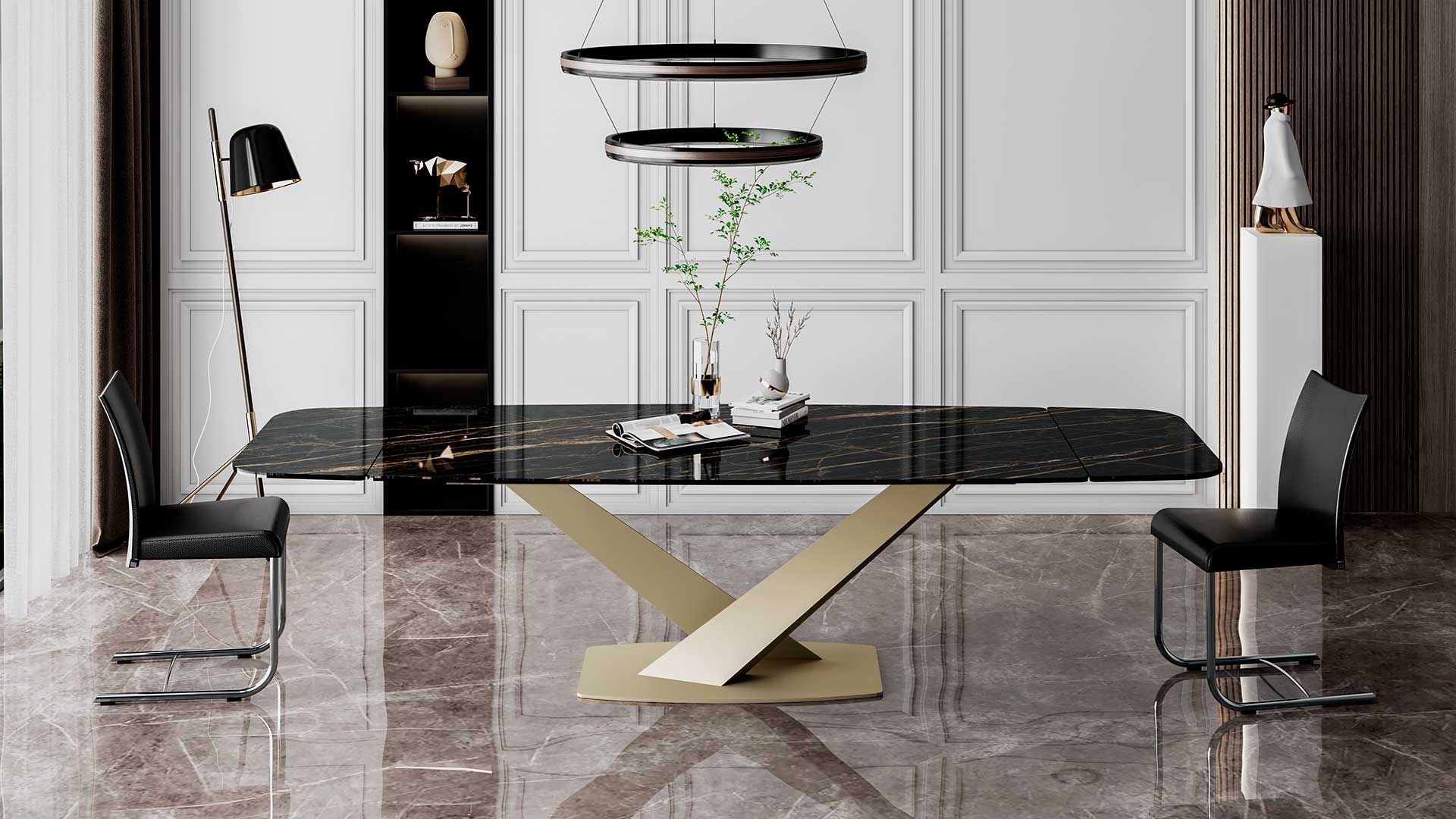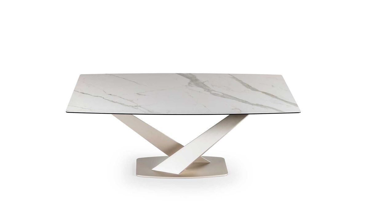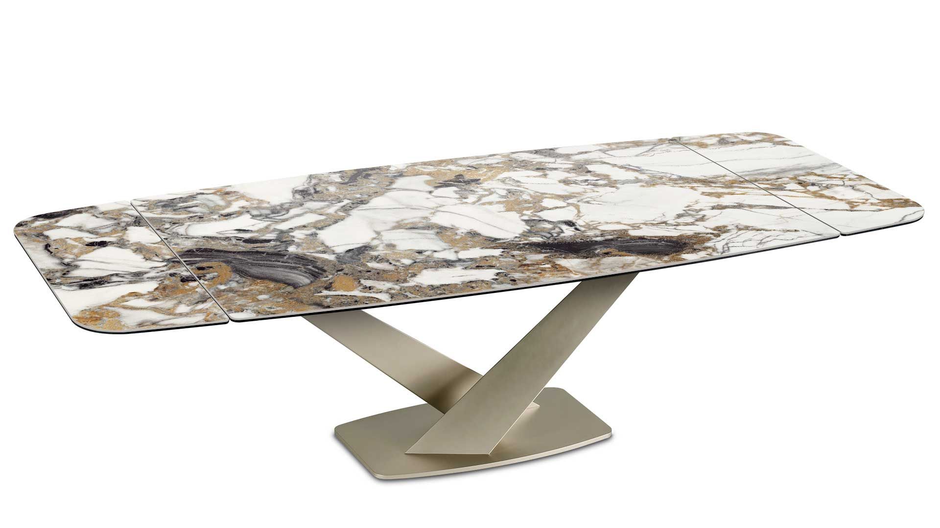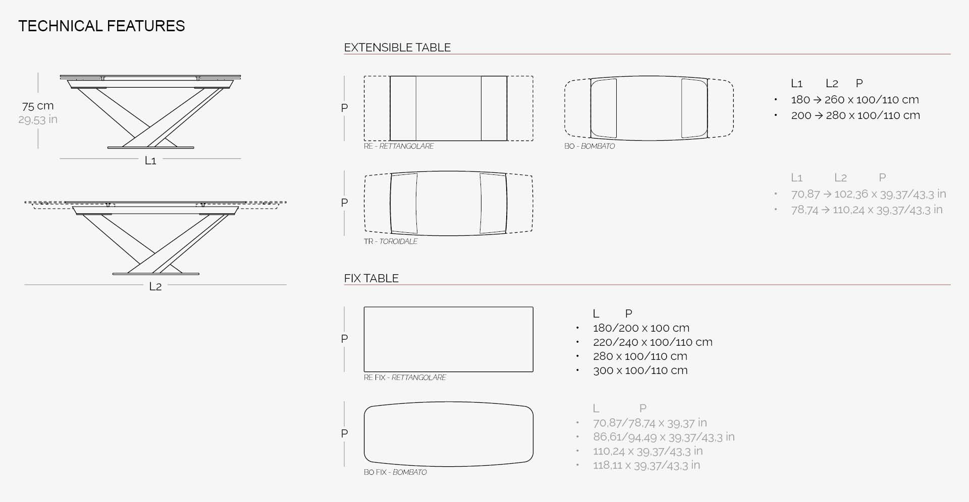 EXTENSIBLE DINING TABLE, WITH TOP AND EXTENSIONS OF GLASS. BASE AND TRACK OF PAINTED METAL. A VERY EASY PATENTED MECHANISM TO PULL OUT THE LATERAL EXTENSIONS ALLOWS THE WIDENING OF THE TOP OF CM 80 (31.5 INCH). AVAILABE ALSO WITH CERAMICS TOPS.