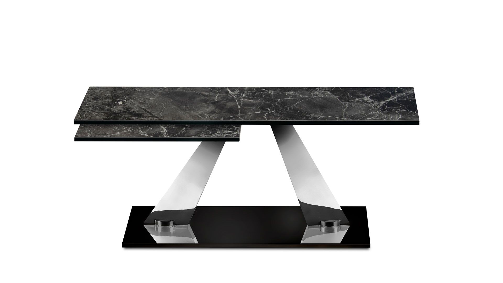 EXTENSIBLE COCKTAIL TABLE WITH SYNCHRONIZED REVOLVING GLASS TOPS. BASE AND SUPPORTS IN GALVANISED OR PAINTED STEEL. AVAILABE ALSO WITH CERAMICS TOPS.