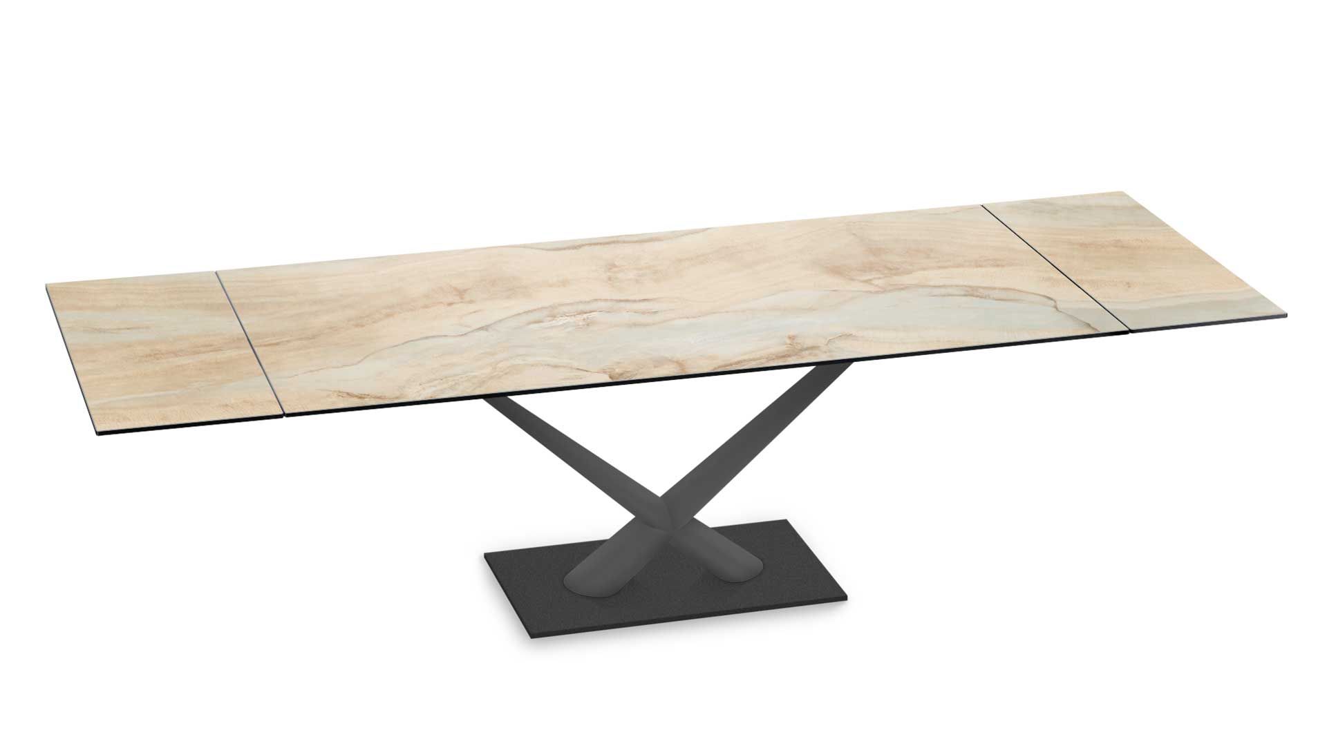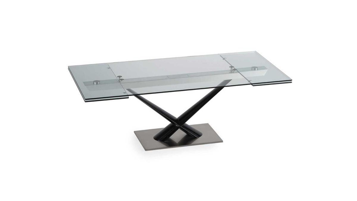 TAVOLO DA PRANZO ESTENSIBILE CON PIANO E PROLUNGHE IN CRISTALLO. GAMBE IN ACCIAIO VERNICIATO. DOTATO DI UN AGEVOLE MECCANISMO BREVETTATO IN ALLUMINIO VERNICIATO O SPAZZOLATO PER ESTRARRE LE PROLUNGHE LATERALI CHE CONSENTE DI AMPLIARE IL PIANO DI CM 80. DISPONIBILE ANCHE CON PIANI IN CERAMICA.