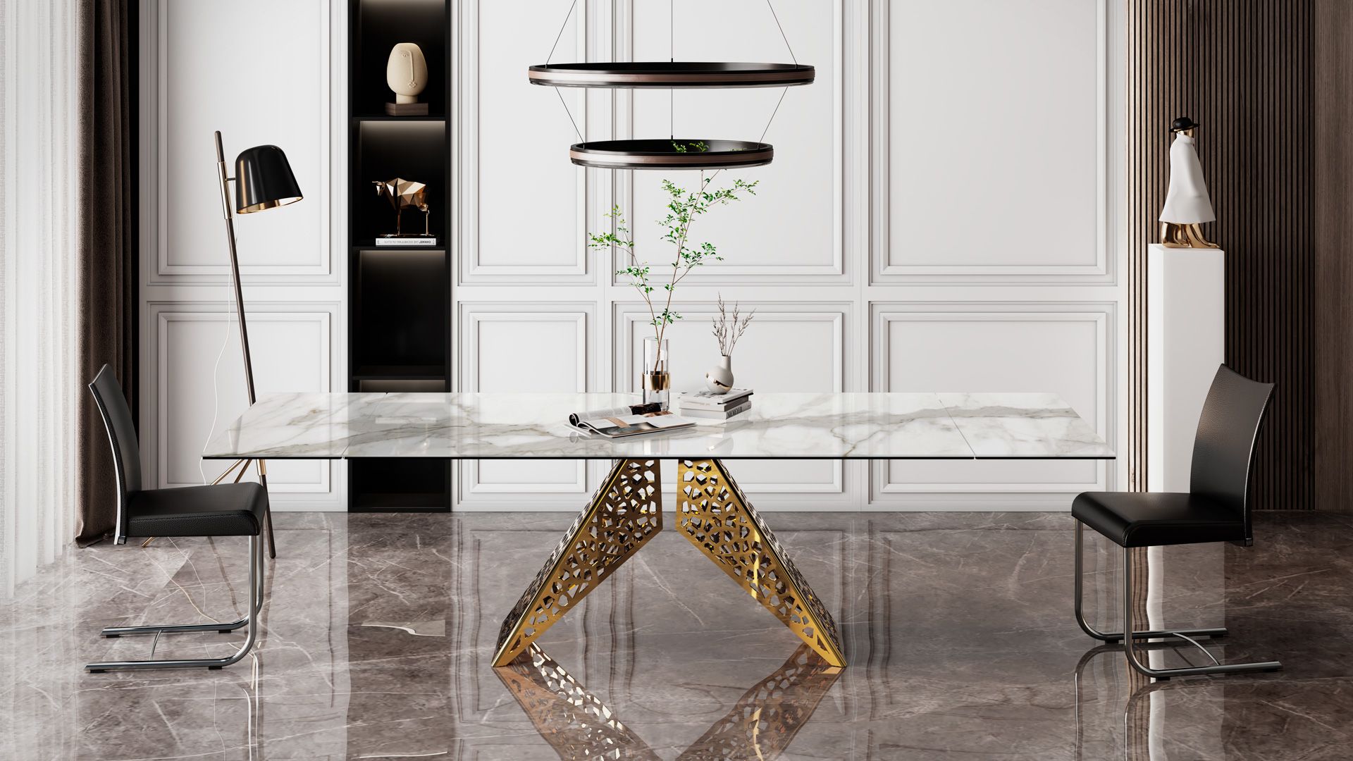 TAVOLO DA PRANZO ESTENSIBILE, CON PIANO E PROLUNGHE IN CRISTALLO. BASE E BINARI IN METALLO VERNICIATO. DOTATO DI UN AGEVOLE MECCANISMO BREVETTATO, PER ESTRARRE LE PROLUNGHE LATERALI CHE CONSENTE DI AMPLIARE IL PIANO DI CM 80. DISPONIBILE ANCHE CON PIANI IN CERAMICA.