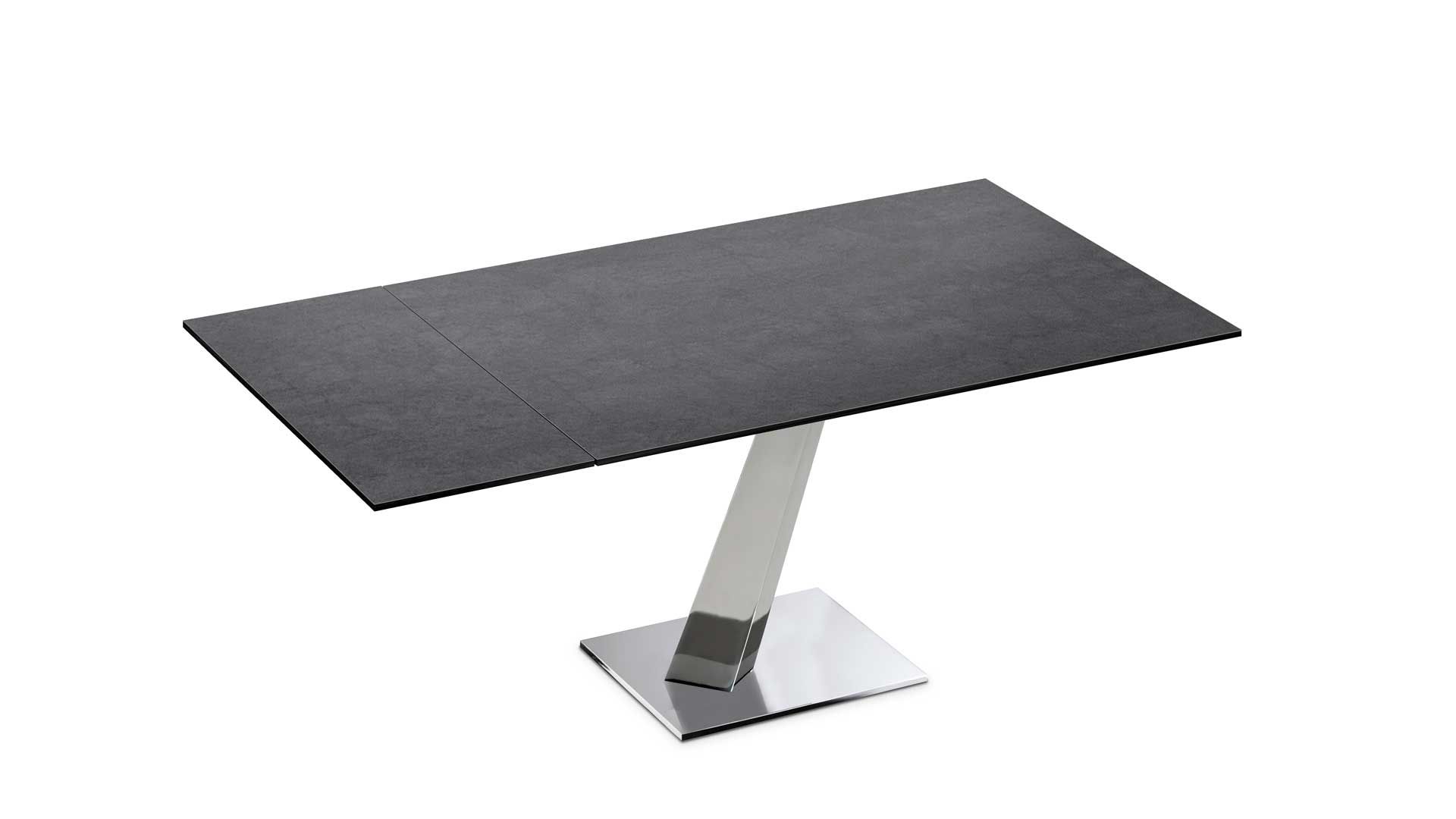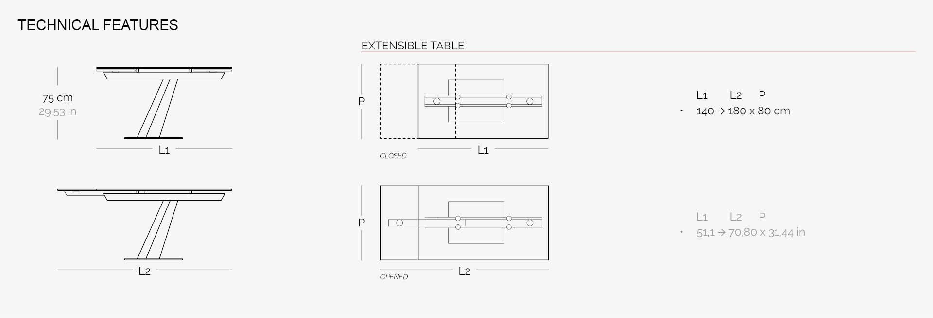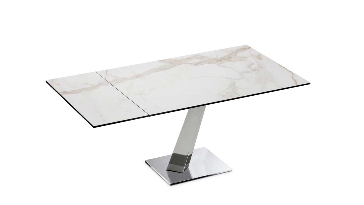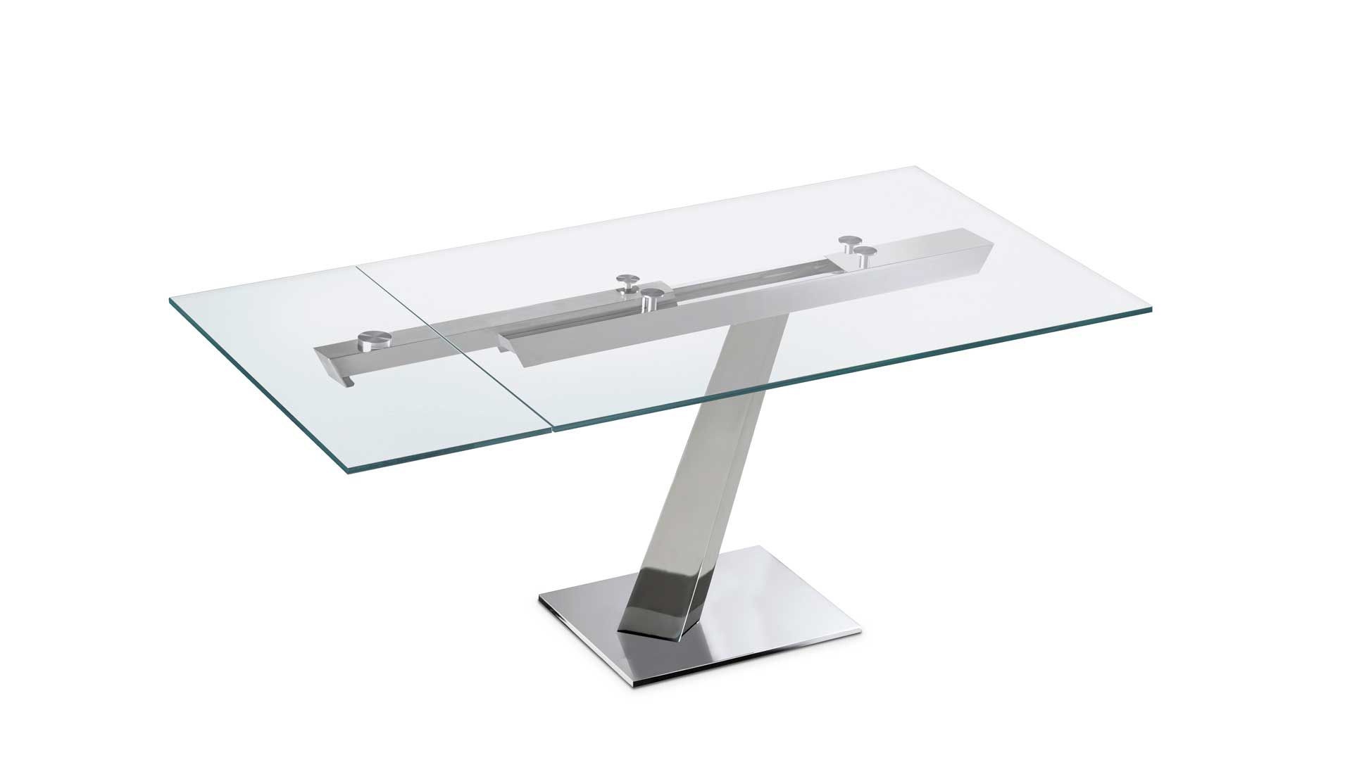 TAVOLO DA PRANZO ESTENSIBILE, CON PIANO E PROLUNGHE IN CRISTALLO. BASE E BINARI IN METALLO CROMATO O VERNICIATO. DOTATO DI UN AGEVOLE MECCANISMO BREVETTATO, PER ESTRARRE LE PROLUNGHE LATERALI CHE CONSENTE DI AMPLIARE IL PIANO DI CM 80. DISPONIBILE IN UN AMPIA GAMMA DI MISURE.