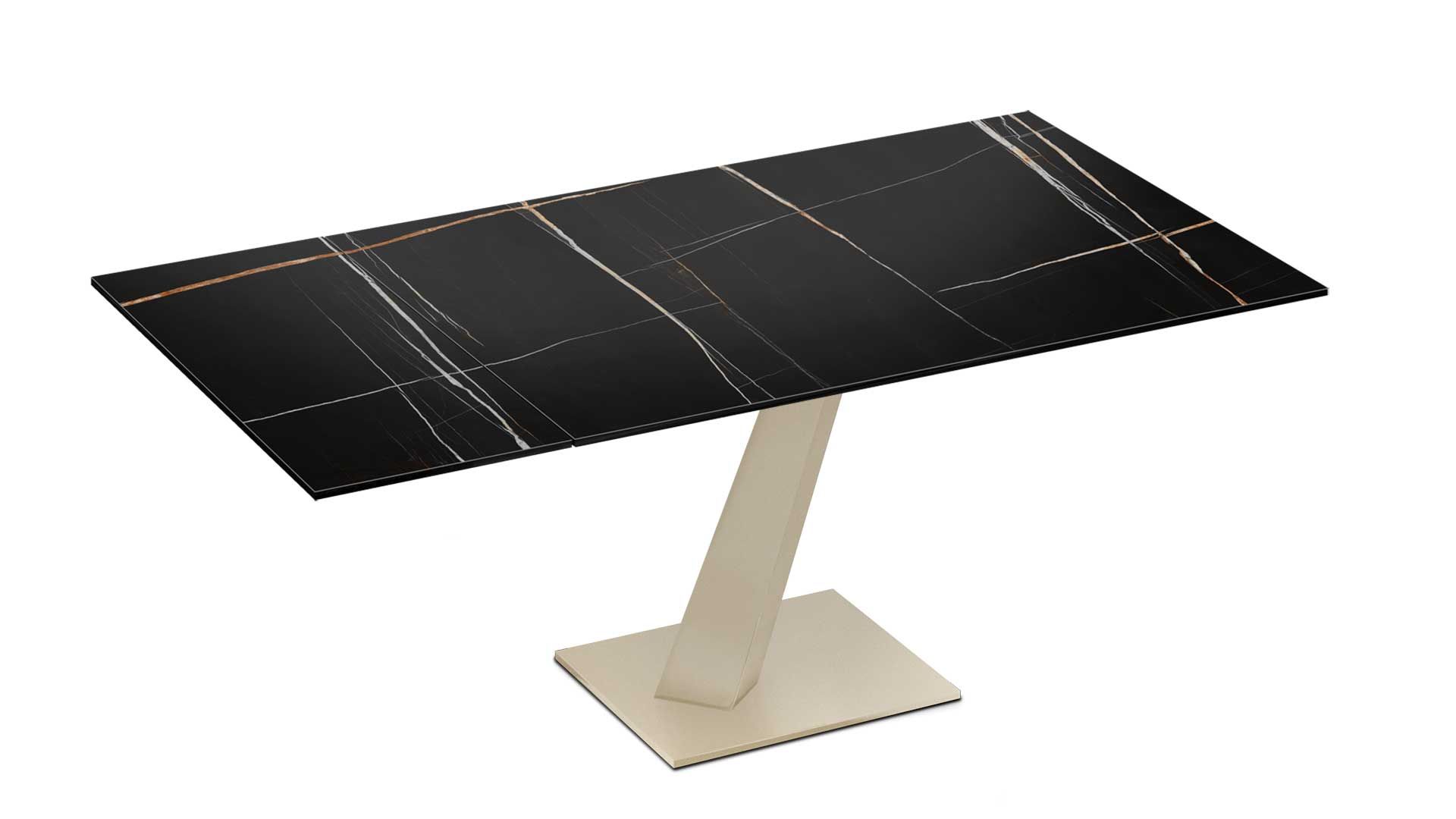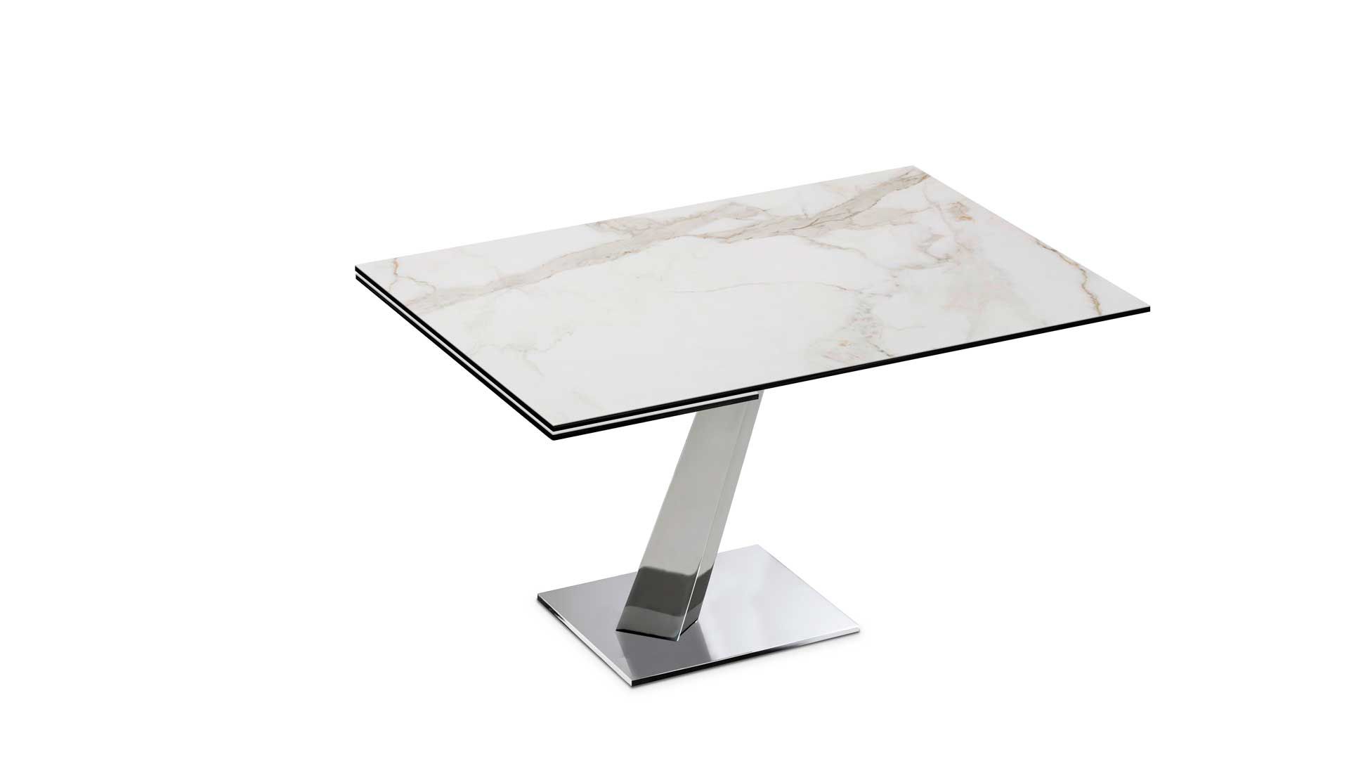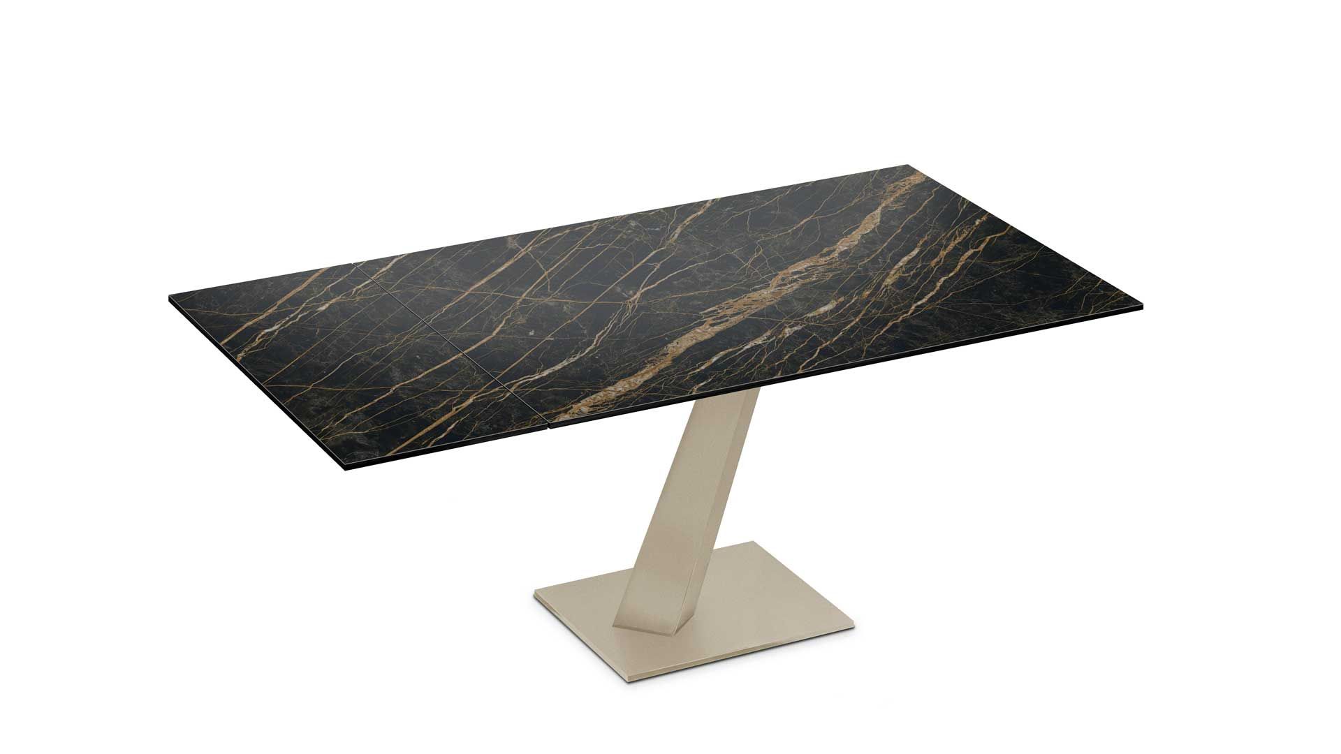 TAVOLO DA PRANZO ESTENSIBILE, CON PIANO E PROLUNGHE IN CRISTALLO. BASE E BINARI IN METALLO CROMATO O VERNICIATO. DOTATO DI UN AGEVOLE MECCANISMO BREVETTATO, PER ESTRARRE LE PROLUNGHE LATERALI CHE CONSENTE DI AMPLIARE IL PIANO DI CM 80. DISPONIBILE IN UN AMPIA GAMMA DI MISURE.