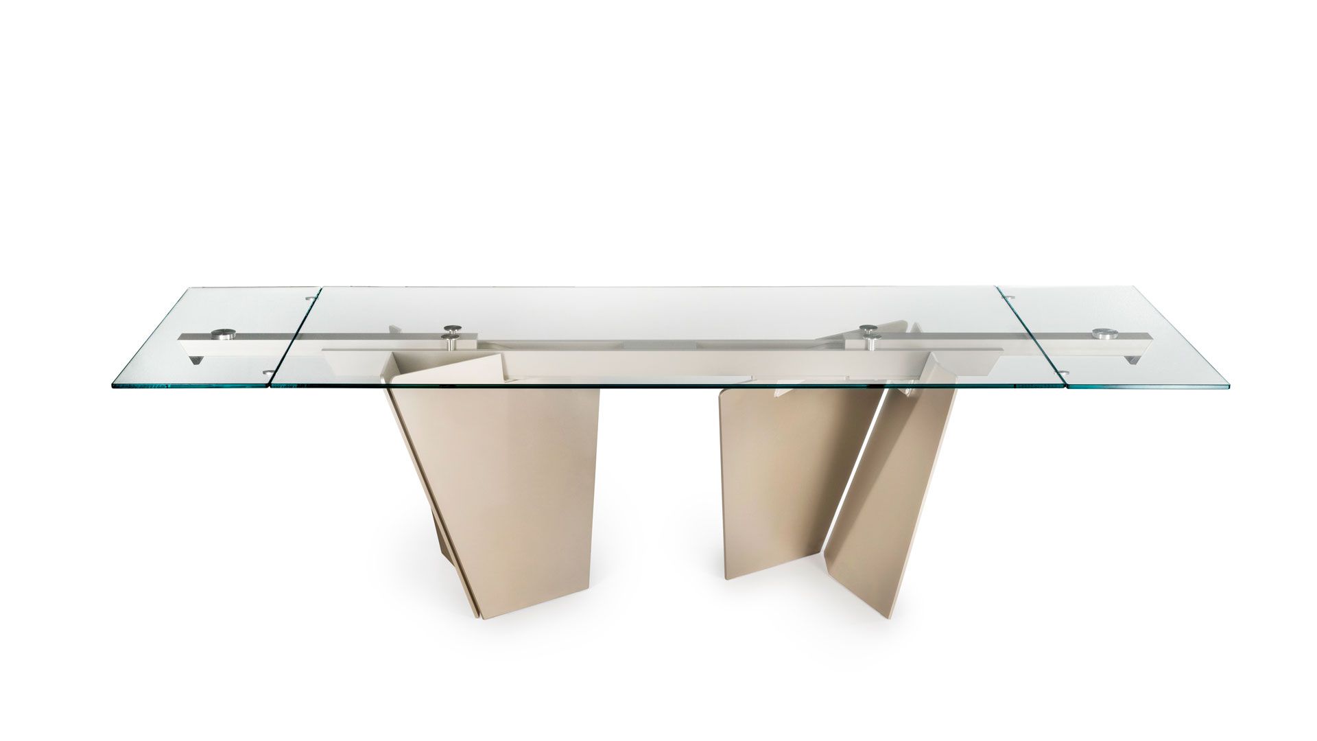 TAVOLO DA PRANZO ESTENSIBILE, CON PIANO E PROLUNGHE IN CRISTALLO. BASE E BINARIO IN METALLO VERNICIATO. DOTATO DI UN AGEVOLE MECCANISMO BREVETTATO, PER ESTRARRE LE PROLUNGHE LATERALI CHE CONSENTE DI AMPLIARE IL PIANO DI CM 80. DISPONIBILE ANCHE CON PIANI IN CERAMICA.