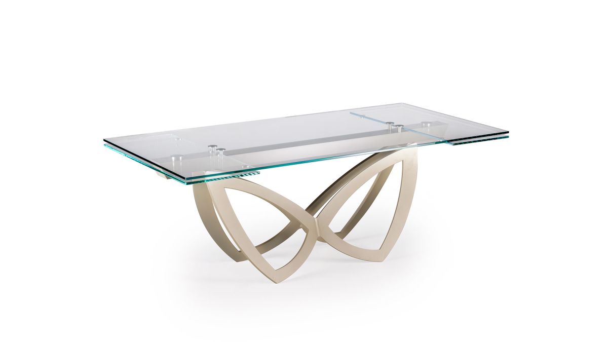 TAVOLO DA PRANZO ESTENSIBILE, CON PIANO E PROLUNGHE IN CRISTALLO. BASE E BINARI IN METALLO CROMATO O VERNICIATO. DOTATO DI UN AGEVOLE MECCANISMO BREVETTATO, PER ESTRARRE LE PROLUNGHE LATERALI CHE CONSENTE DI AMPLIARE IL PIANO DI CM 80. DISPONIBILE ANCHE CON PIANI IN CERAMICA.