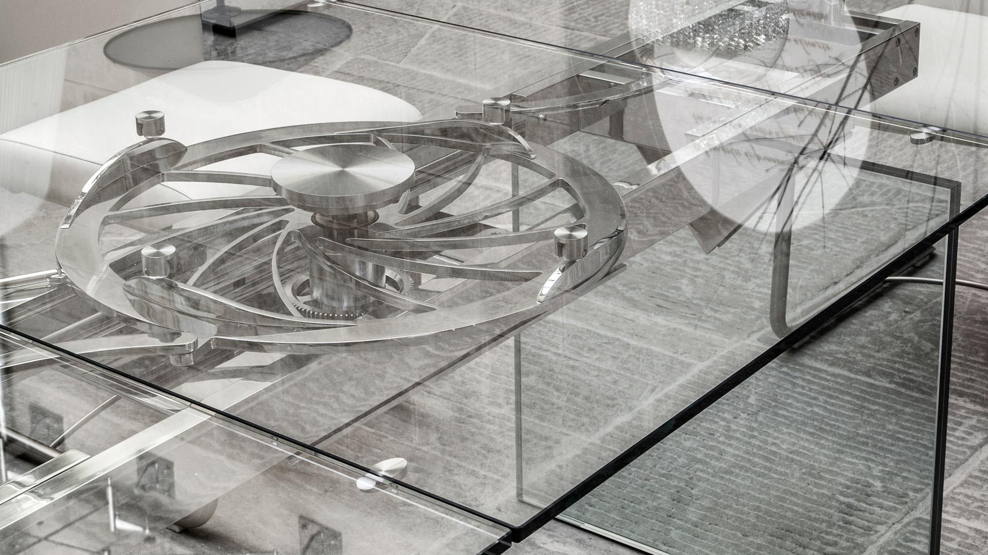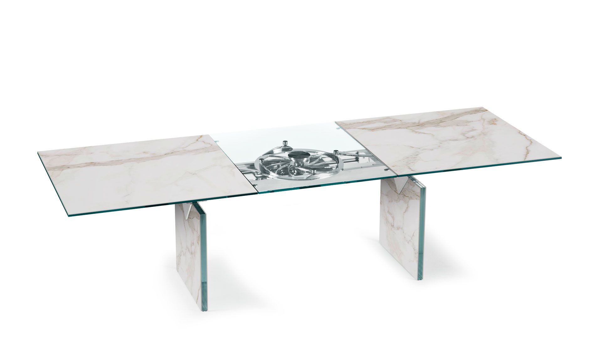 TAVOLO DA PRANZO ESTENSIBILE CON PIANI E PROLUNGA IN CRISTALLO O CERAMICA. GAMBE IN ACCIAIO CROMATO O IN CRISTALLO STRATIFICATO DOTATO DI MECCANISMO SINCRONIZZATO PER L‘APERTURA DEI PIANI LATERALI E L‘INNALZAMENTO DELL‘ALLUNGA CENTRALE. DISPONIBILE CON O SENZA MOTORE E TELECOMANDO.