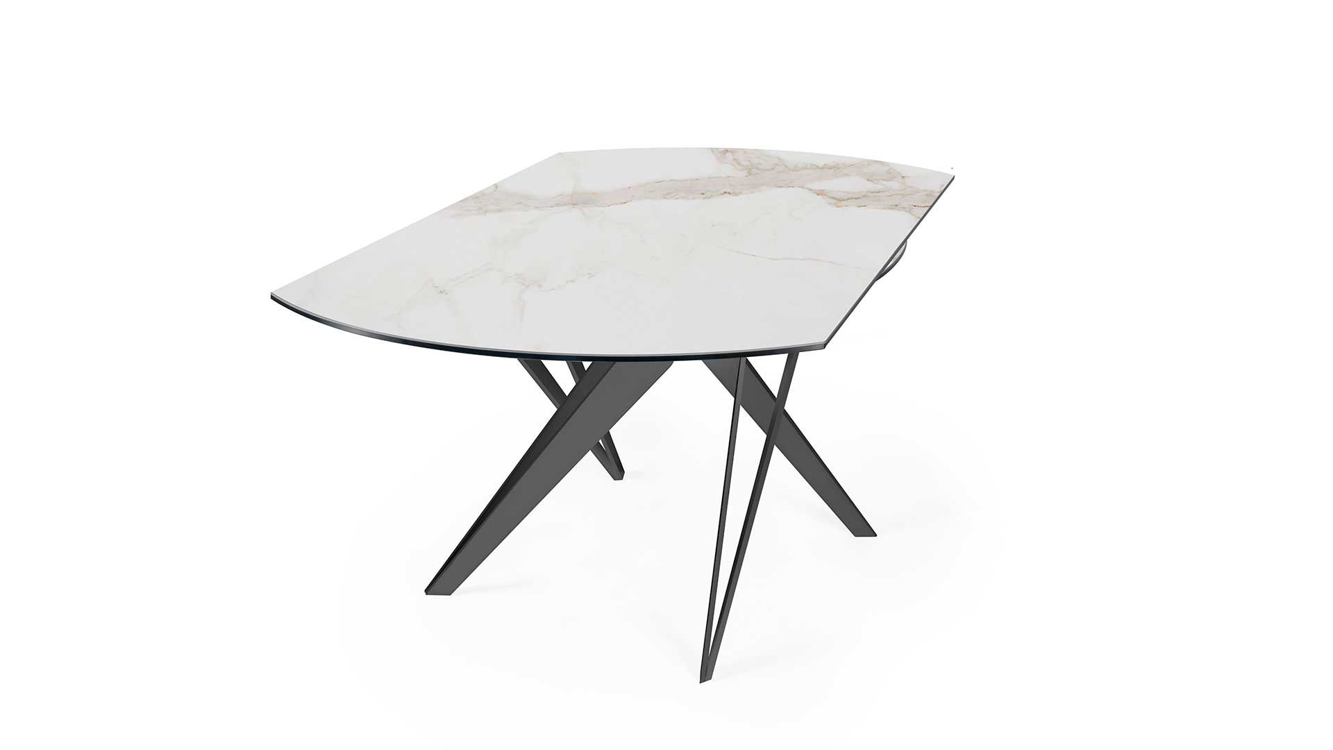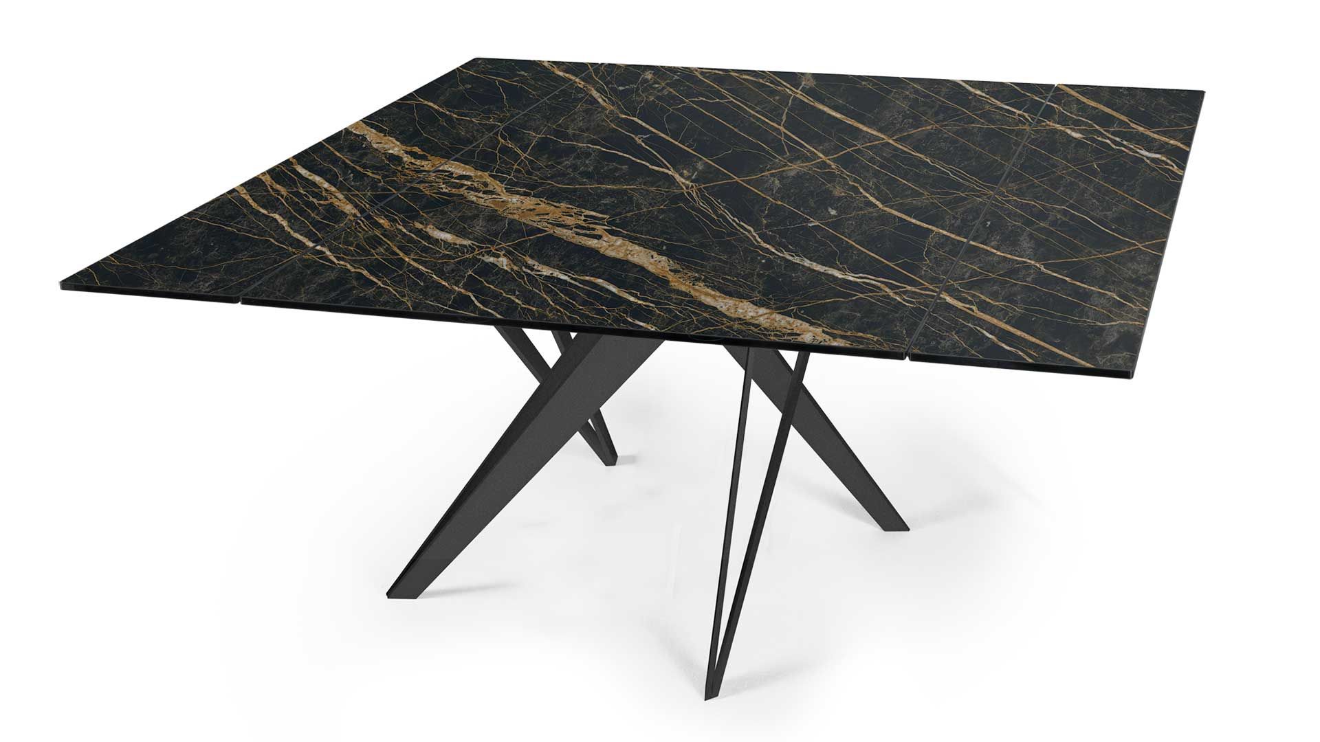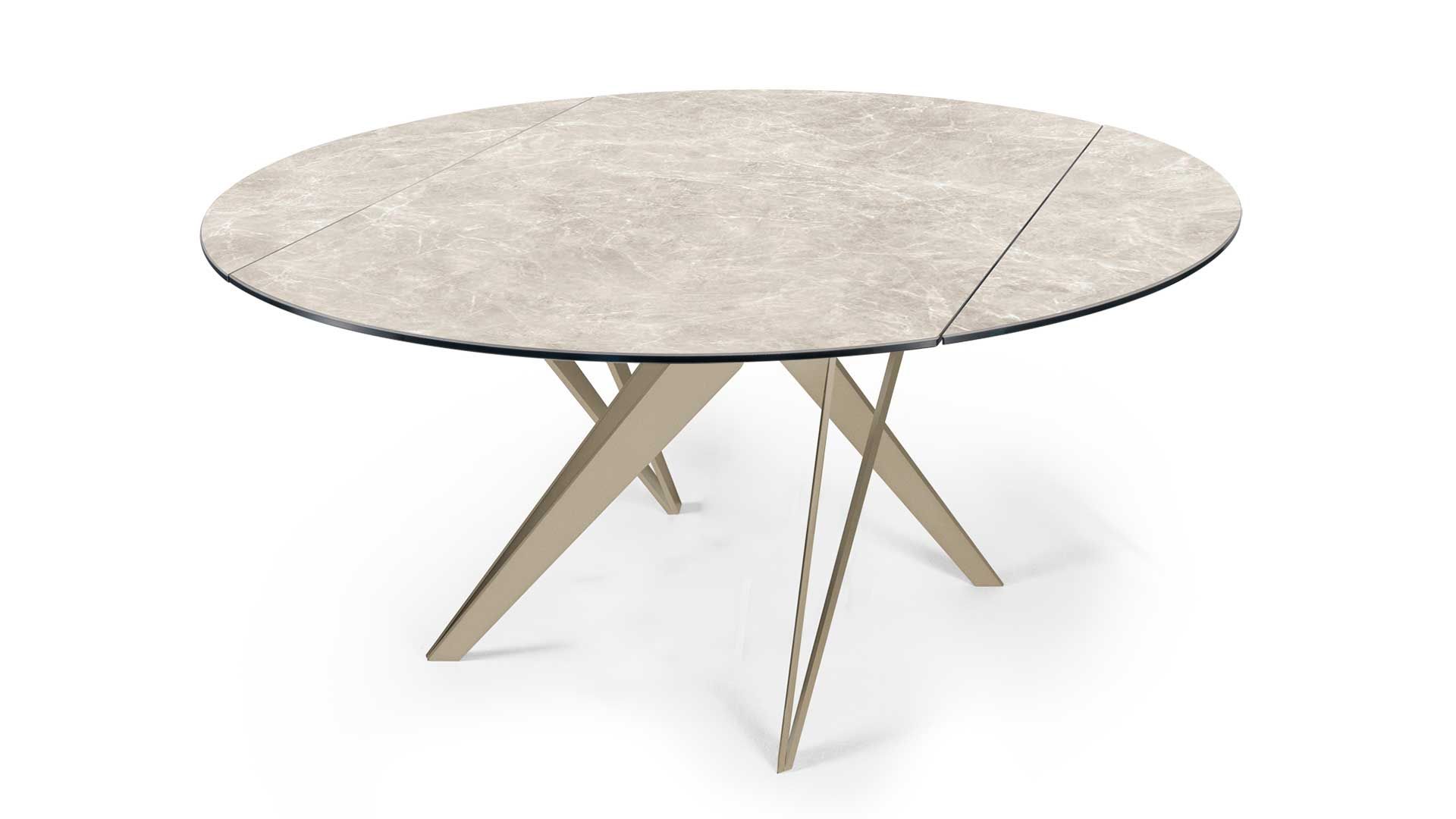 TAVOLO DA PRANZO ALLUNGABILE O FISSO, DI FORMA TONDA O QUADRATA. PIANO E PROLUNGHE DISPONIBILI CRISTALLO O CERAMICA. STRUTTURA IN METALLO VERNICIATO. DOTATO DI UN AGEVOLE MECCANISMO BREVETTATO, CHE CON UN SEMPLICE MOVIMENTO, CONSENTE DI ALLUNGARNE IL PIANO.