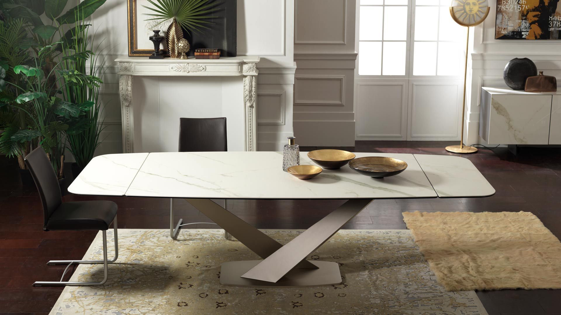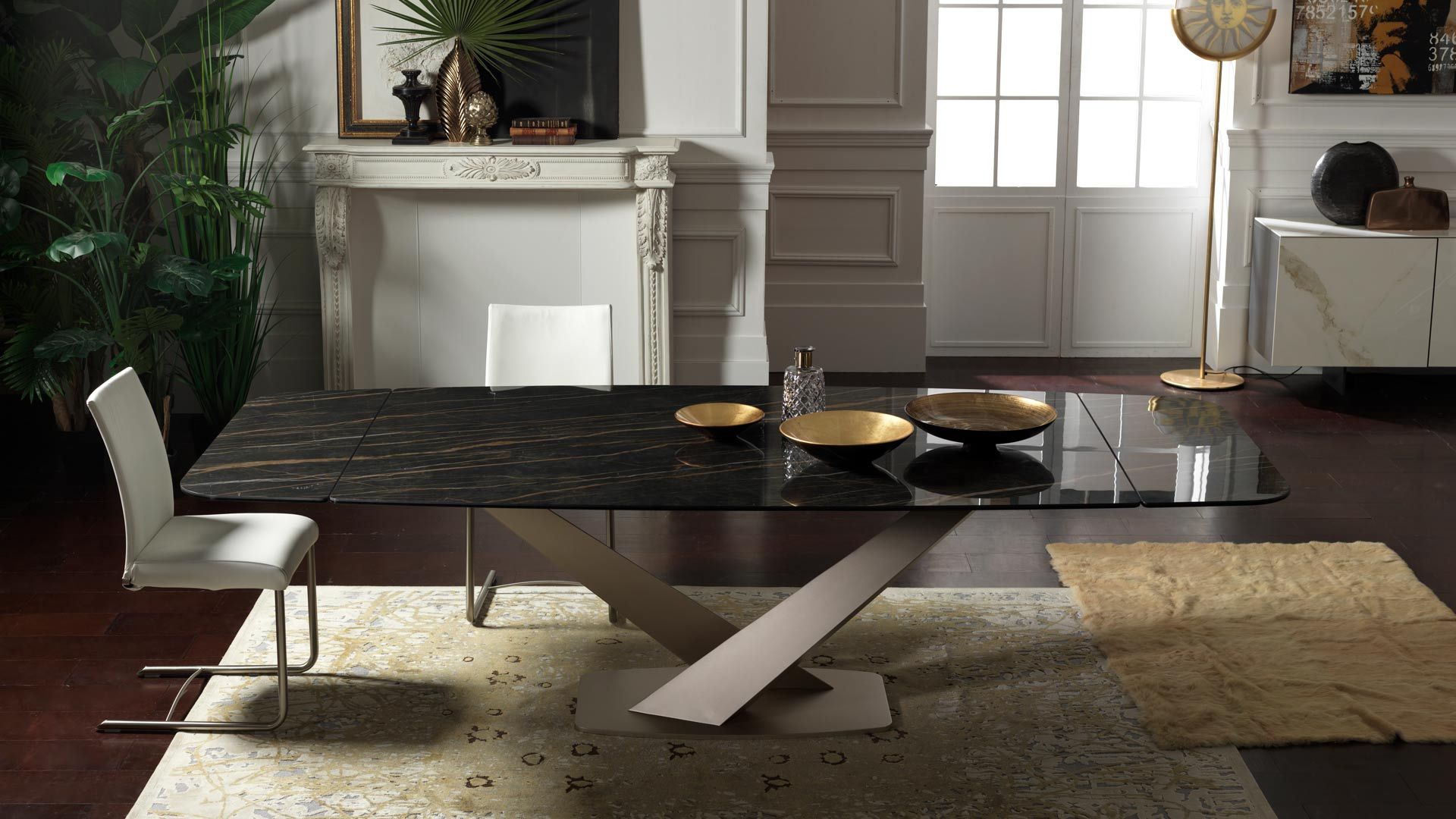 TAVOLO DA PRANZO ESTENSIBILE, CON PIANO E PROLUNGHE IN CRISTALLO. BASE E BINARIO IN METALLO VERNICIATO. DOTATO DI UN AGEVOLE MECCANISMO BREVETTATO, PER ESTRARRE LE PROLUNGHE LATERALI CHE CONSENTE DI AMPLIARE IL PIANO DI CM 80. DISPONIBILE ANCHE CON PIANI IN CERAMICA.