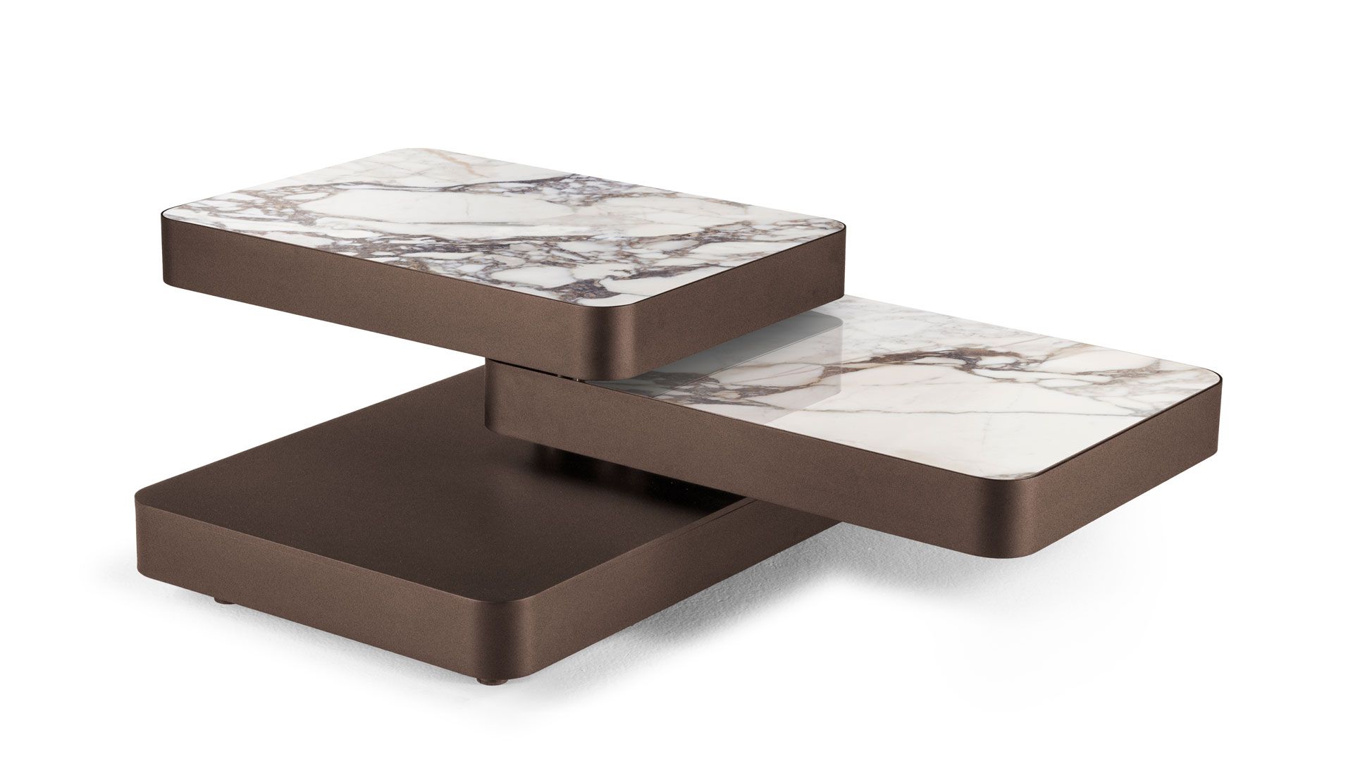 TAVOLINO ESTENSIBILE IN FORMA QUADRATA CON PIANI IN CERAMICA. STRUTTURA DISPONIBILE NELLE FINITURE VERNICIATE. DOTATO DI MECCANISMO PER L'APERTURA SINCRONIZZATA DEI DUE PIANI.