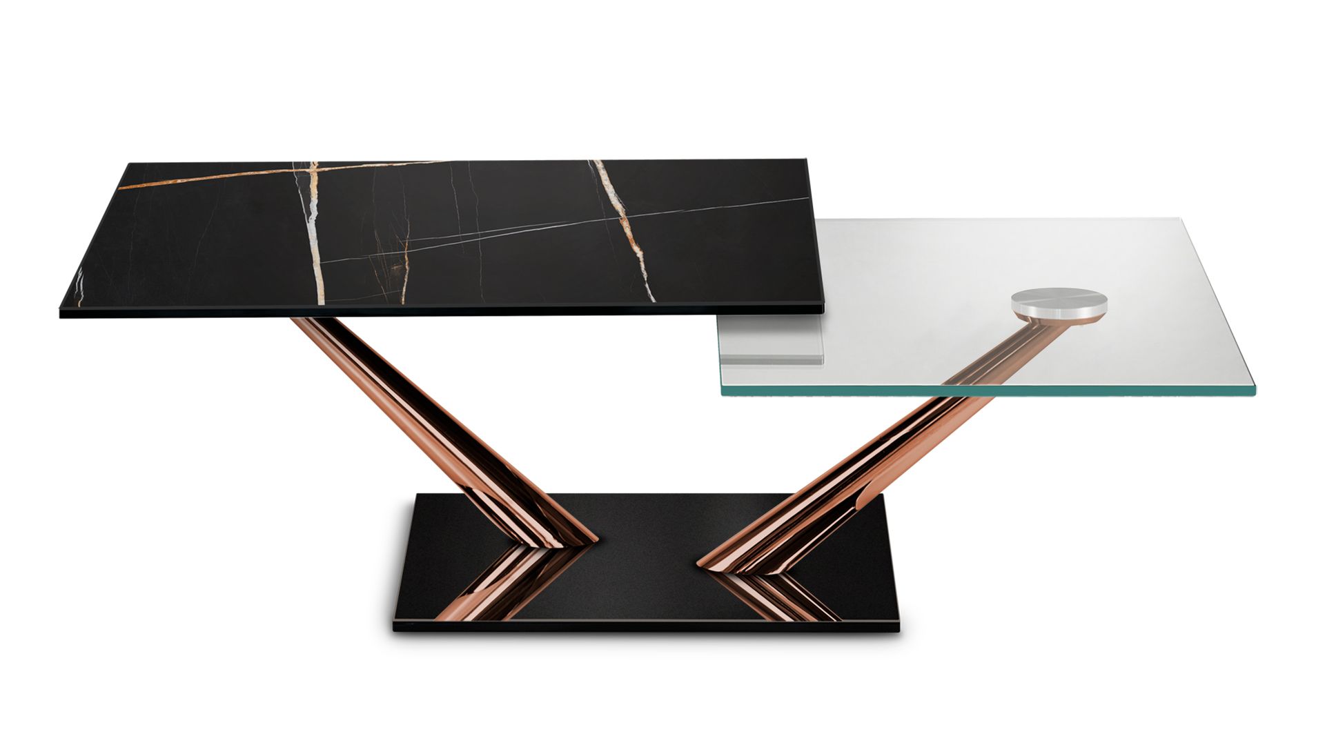 TAVOLINO ESTENSIBILE CON PIANI GIREVOLI SINCRONIZZATI IN CRISTALLO. BASE E SUPPORTI IN ACCIAIO VERNICIATO O GALVANIZZATO. DISPONIBILE ANCHE CON BASE IN CERAMICA, CRISTALLO VERNICIATO O SPECCHIO. PIANI DISPONIBILI IN CERAMICA.