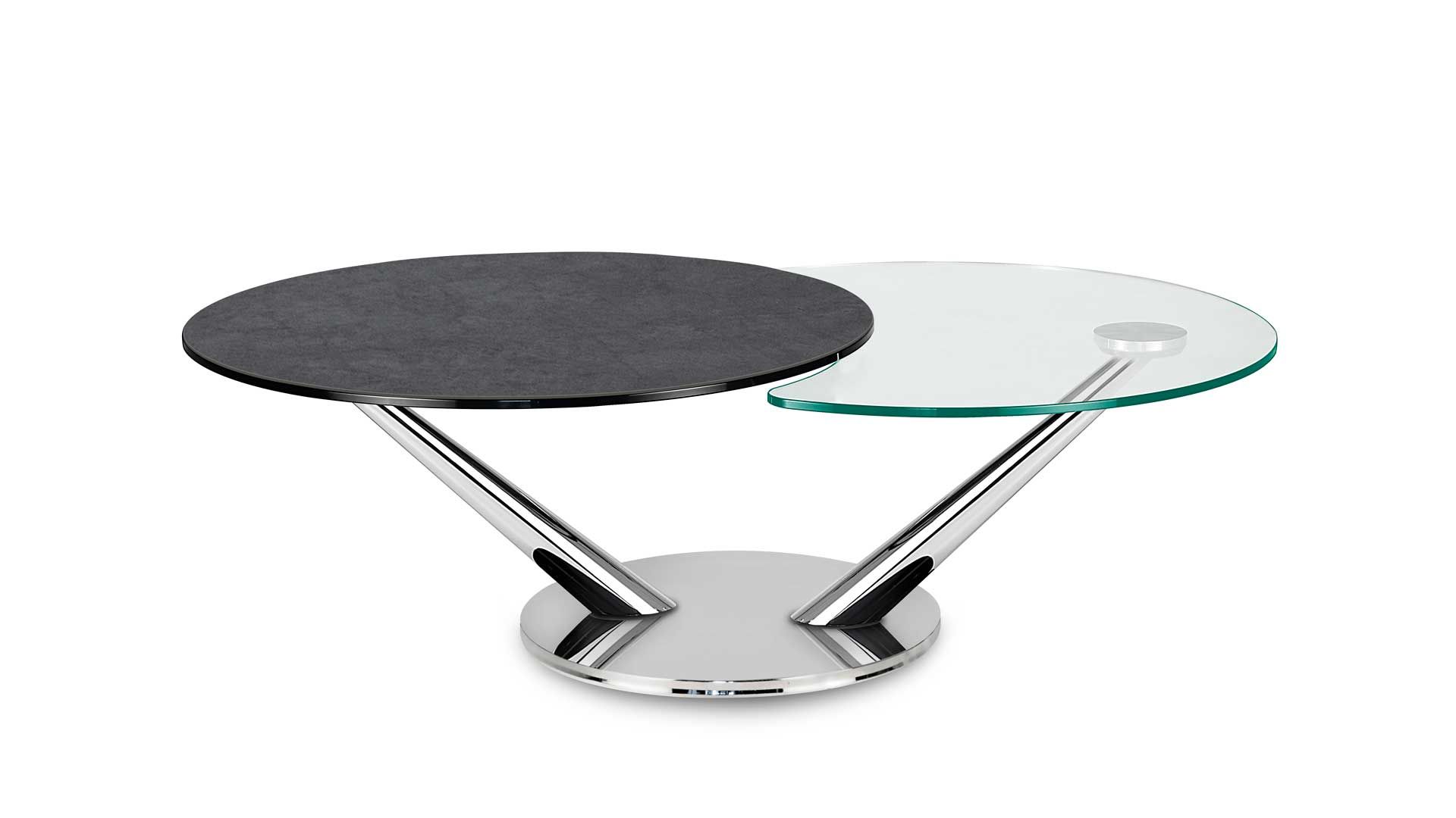 TAVOLINO ESTENSIBILE CON PIANI GIREVOLI SINCRONIZZATI IN CRISTALLO. BASE E SUPPORTI IN ACCIAIO VERNICIATO O GALVANIZZATO. LA BASE E’ DOTATA DI UN MECCANISMO PER LA ROTAZIONE SINCRONIZZATA, CHE CONSENTE UN’AMPIA MODULAZIONE DELLA FORMA. DISPONIBILE ANCHE CON PIANI IN CERAMICA.