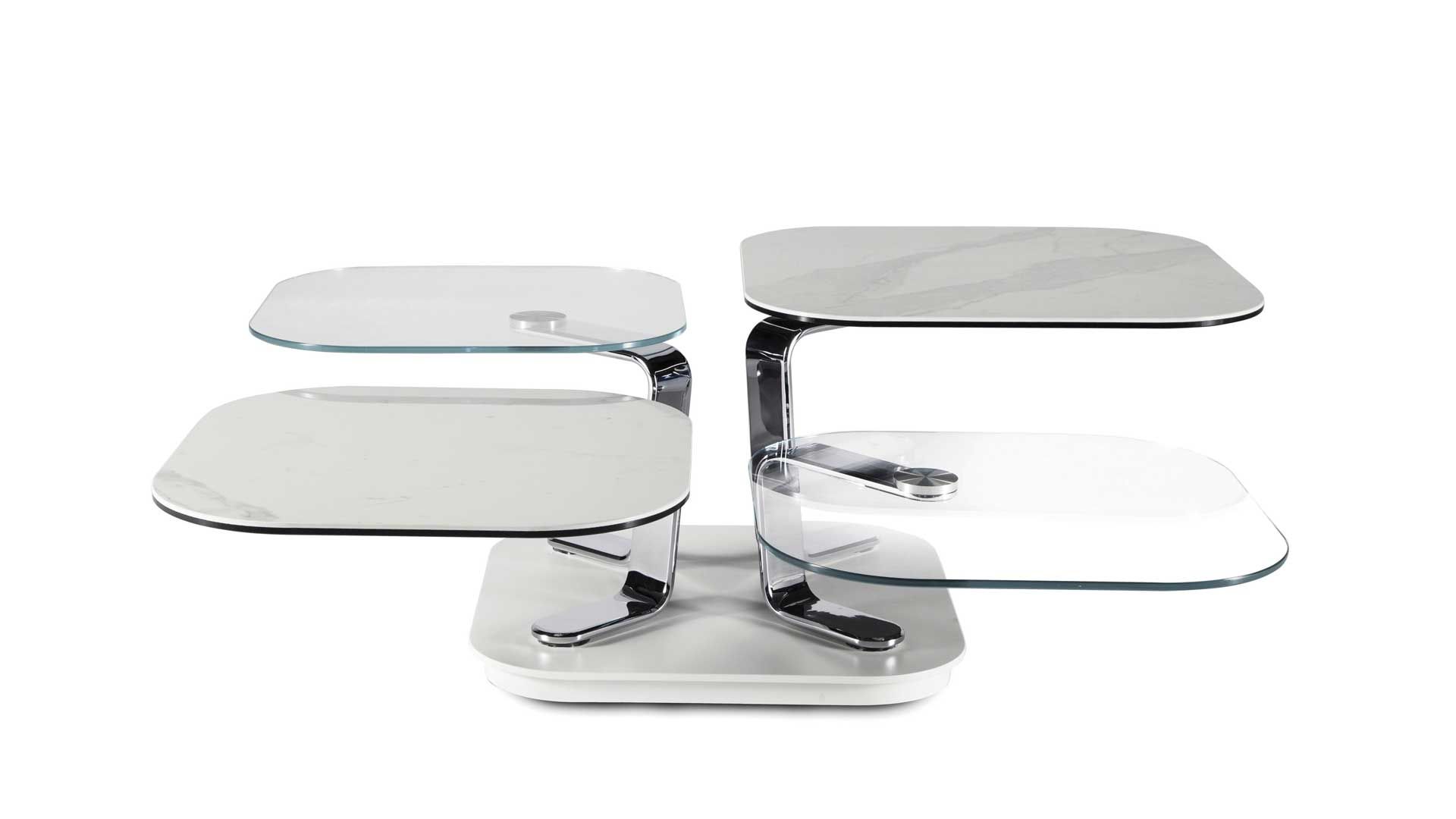 TAVOLINO ESTENSIBILE CON 4 PIANI IN CRISTALLO O CERAMICA. DOTATO DI UN INNOVATIVO DOPPIO MECCANISMO SINCRONIZZATO DI APERTURA CHE PERMETTE AI 4 CRISTALLI DI APRIRSI CON UN SOLO GESTO MA IN DIREZIONI OPPOSTE.SUPPORTI IN ACCIAIO VERNICIATO O CROMATO.