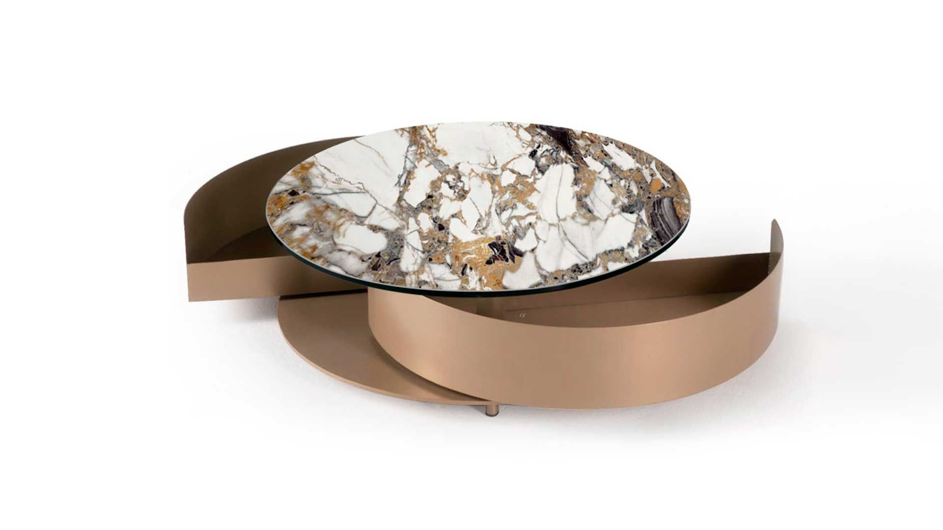 TAVOLINO ROTONDO APRIBILE CON PIANI IN CERAMICA O IN CRISTALLO. BASE E CASSETTI DISPONIBILI NELLE FINITURE VERNICIATE. DOTATO DI MECCANISMO PER L'APERTURA SINCRONIZZATA DEI 2 CASSETTI.