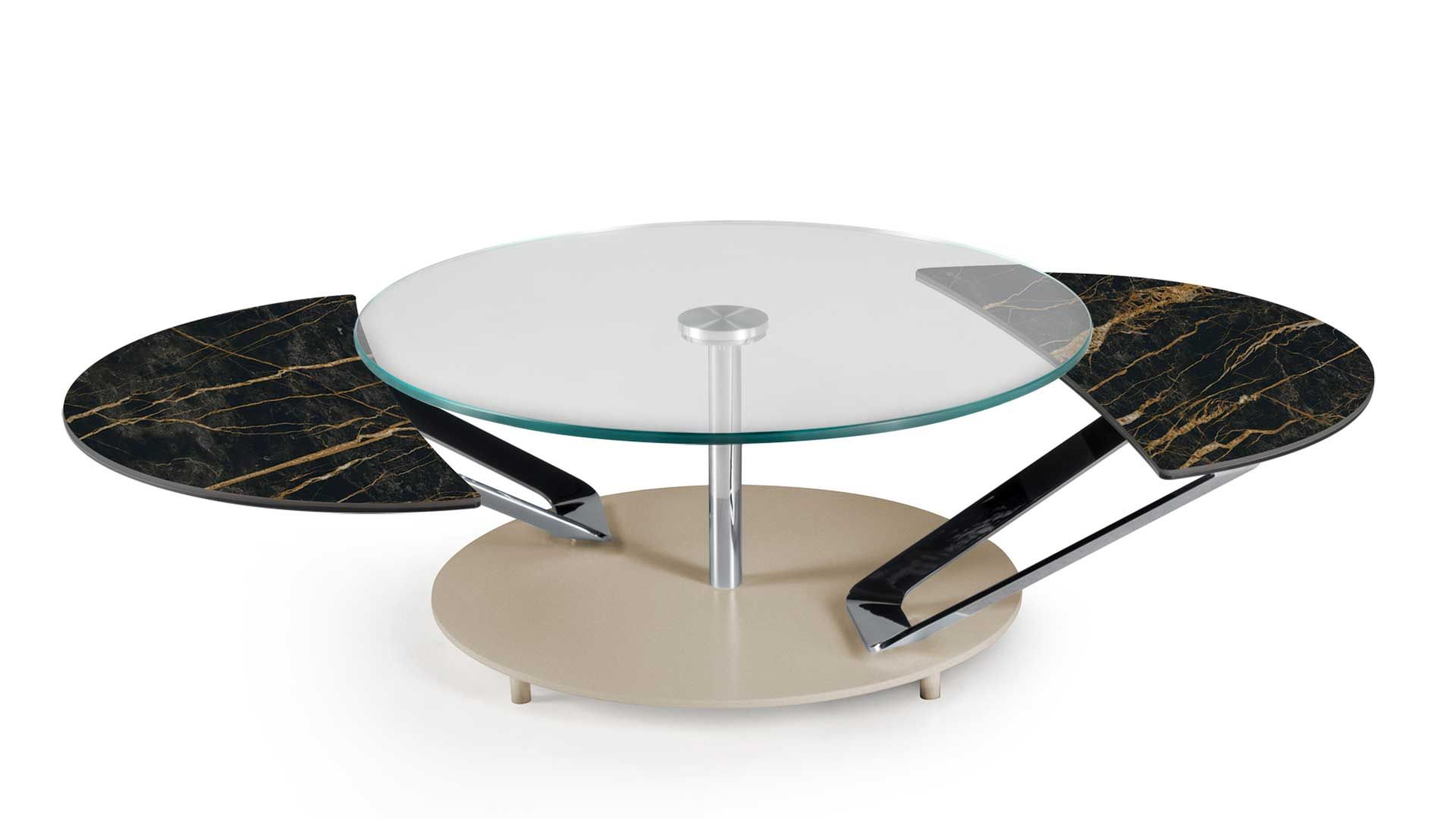 TAVOLINO ESTENSIBILE CON 3 PIANI IN CRISTALLO O CERAMICA. DOTATO DI UN INNOVATIVO MECCANISMO SINCRONIZZATO DI APERTURA CHE PERMETTE AI 2 CRISTALLI DI APRIRSI CON UN SOLO GESTO. SUPPORTI IN ACCIAIO VERNICIATO O CROMATO.